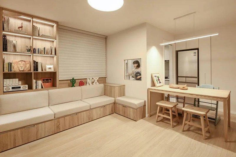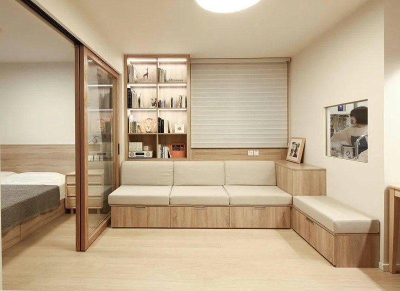 整个客厅进行了重新的规划,空间缩小,通过透明玻璃门隔出了一件小小的卧室,供李先生夫妇使用。墙面米白色的乳胶漆与地面的原木色的木地板相呼应,让整体空间看起来更清新自然了。定制的转角沙发,下面还增加了收纳功能真的是非常的实用。垂直的窗户边打入了一个开放式置物架,可用于摆放图书和工艺品。