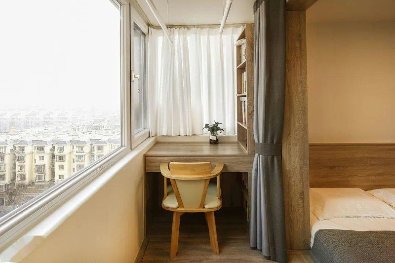 主卧选择了定制的顶天立地柜,榻榻米床,充分的利用了墙面与地面的空间,原木色床头、榻榻米、木地板,都是沿用了客厅的日式风格。主卧连接了阳台,明媚的阳光透过窗户照射进房间,清晨的第一缕光将是唤醒新一天的晨钟。阳台当头设置了一个独立的办公区域,方便李先生在家临时办公。