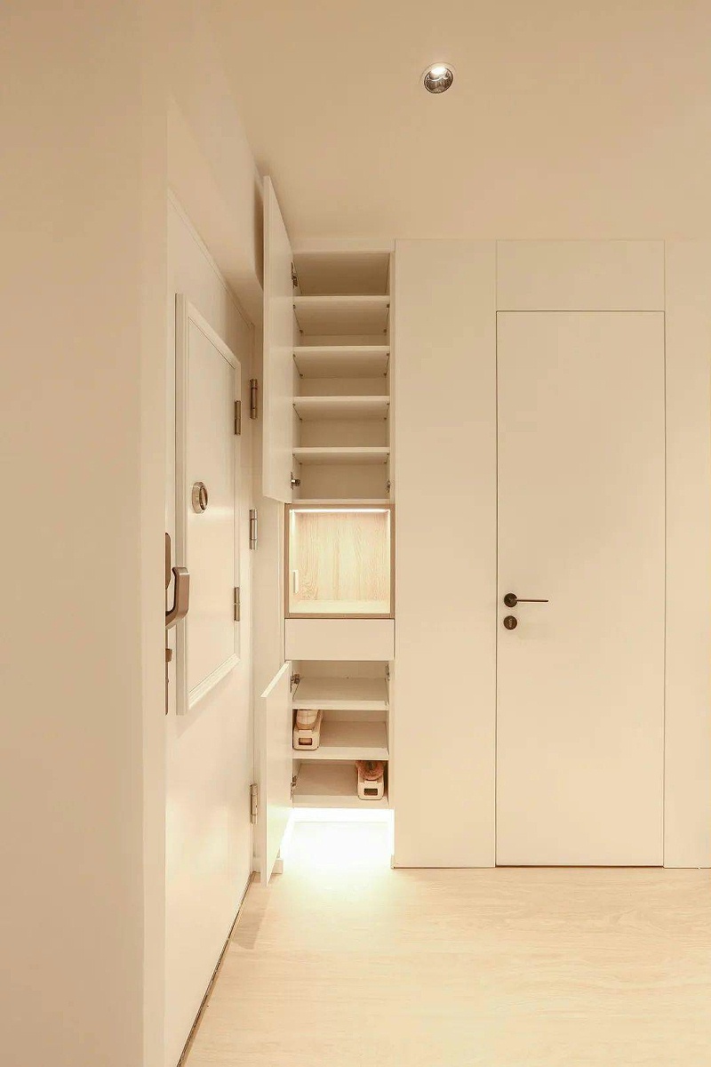 经过对卫生间墙体的局部改动,小心的规划出了一个嵌入式玄关,中间镂空和底部留空的设计,搭配隐形的灯带,柔和的色泽,在灯光的映衬下,有着几分韵味与别致,整体的布置都透露出现代与古朴相交融的典雅质感,为奔波劳累一天的人们,提供了一个舒适的伊甸园。