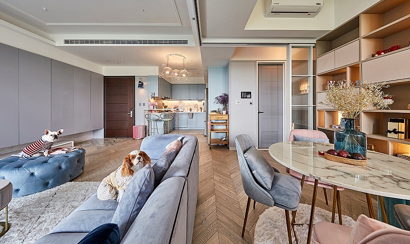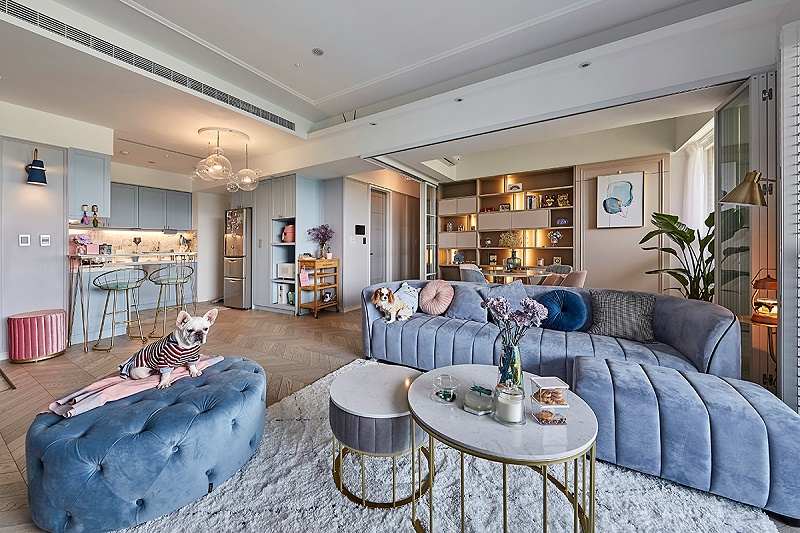 整个空间是采用的中性灰色基调,主体颜色则是选择的水果蓝,气孔圆凳、磨毛沙发、小巧抱枕、开放式的厨房,通过不同的深浅层次来定调,使得整体上看起来更加的和谐美观,犹如层层滤镜,打造出了微甜轻奢风。