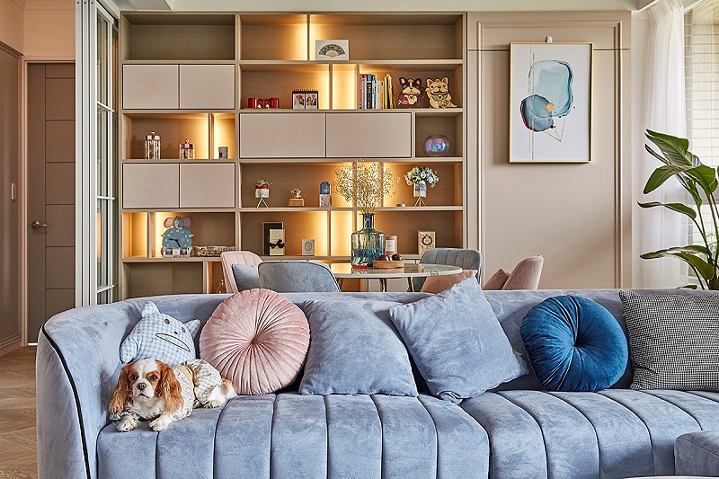 书架选择了相对温柔的颜色,米色和柔粉色,博物台错落有序的造型设计,再搭配上温馨的灯带,显得十分的浪漫神秘。从细节就能看出,不同色系的单色座椅与客厅的沙发配色相呼应,让这个家充满了甜而不腻的优雅范。