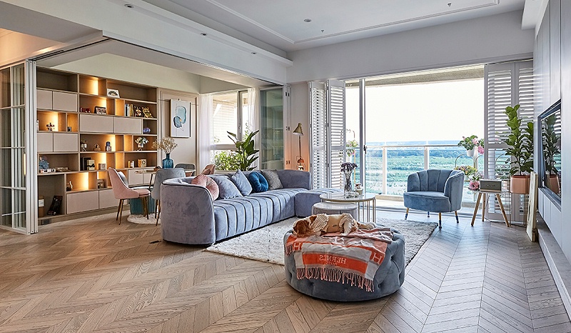 放眼望去,是不是有种网红甜品店的即视感?古象地板安装的鱼骨拼、经典百叶窗、布艺简欧式沙发等物件,烘托出温馨唯美的情调。临窗随意摆放的几株绿植,为整个空间又增添了几分生机。