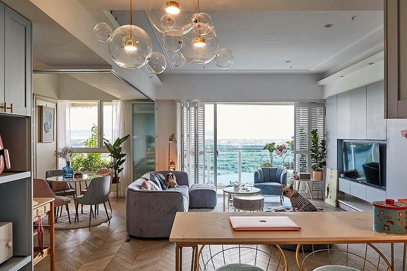 沙发后面是安装了可以随意折叠的玻璃门,可以根据生活需求灵活的移动玻璃门。将玻璃门完全折叠起来后,公共空间就变成了一个大横厅,明亮且宽敞。